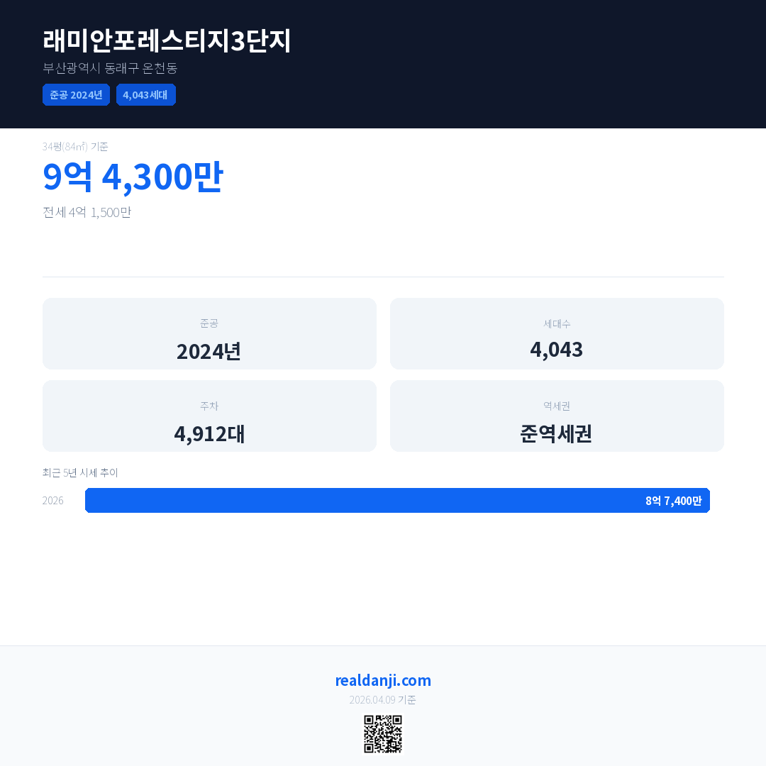 래미안포레스티지3단지 최근 거래가는 9억 4,300만입니다. (2026-03)