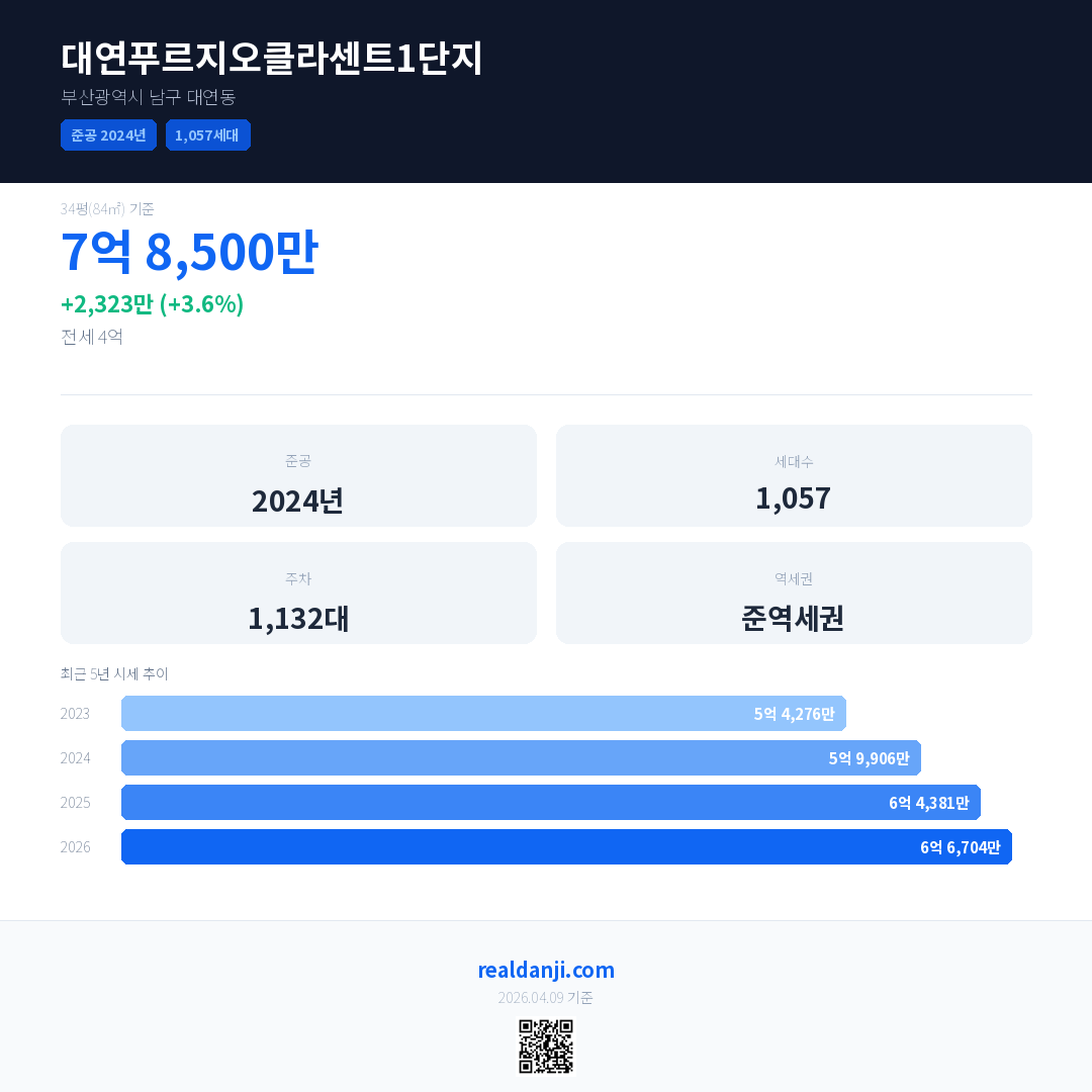 대연푸르지오클라센트1단지 국민평형 기준 2026년 평균 거래가는 6억 6,704만으로, 전년 대비 3.6% 상승 했습니다.