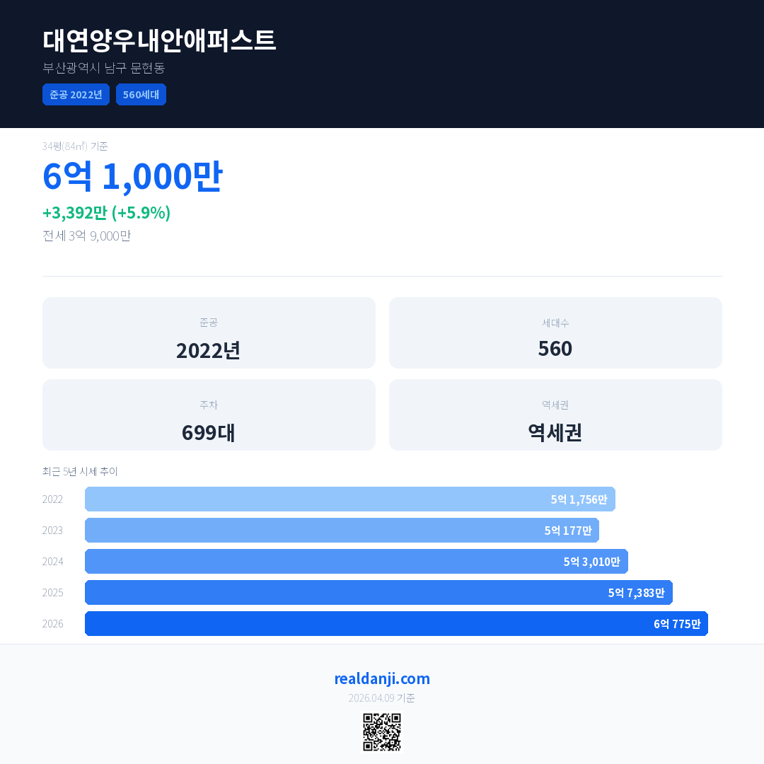 대연양우내안애퍼스트 국민평형 기준 2026년 평균 거래가는 6억 775만으로, 전년 대비 5.9% 상승 했습니다.