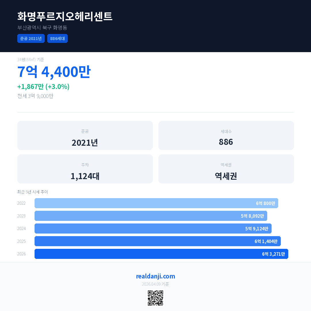 화명푸르지오헤리센트은(는) 2021년에 준공되었으며, 현재 5년차입니다. 총 886세대 규모입니다.