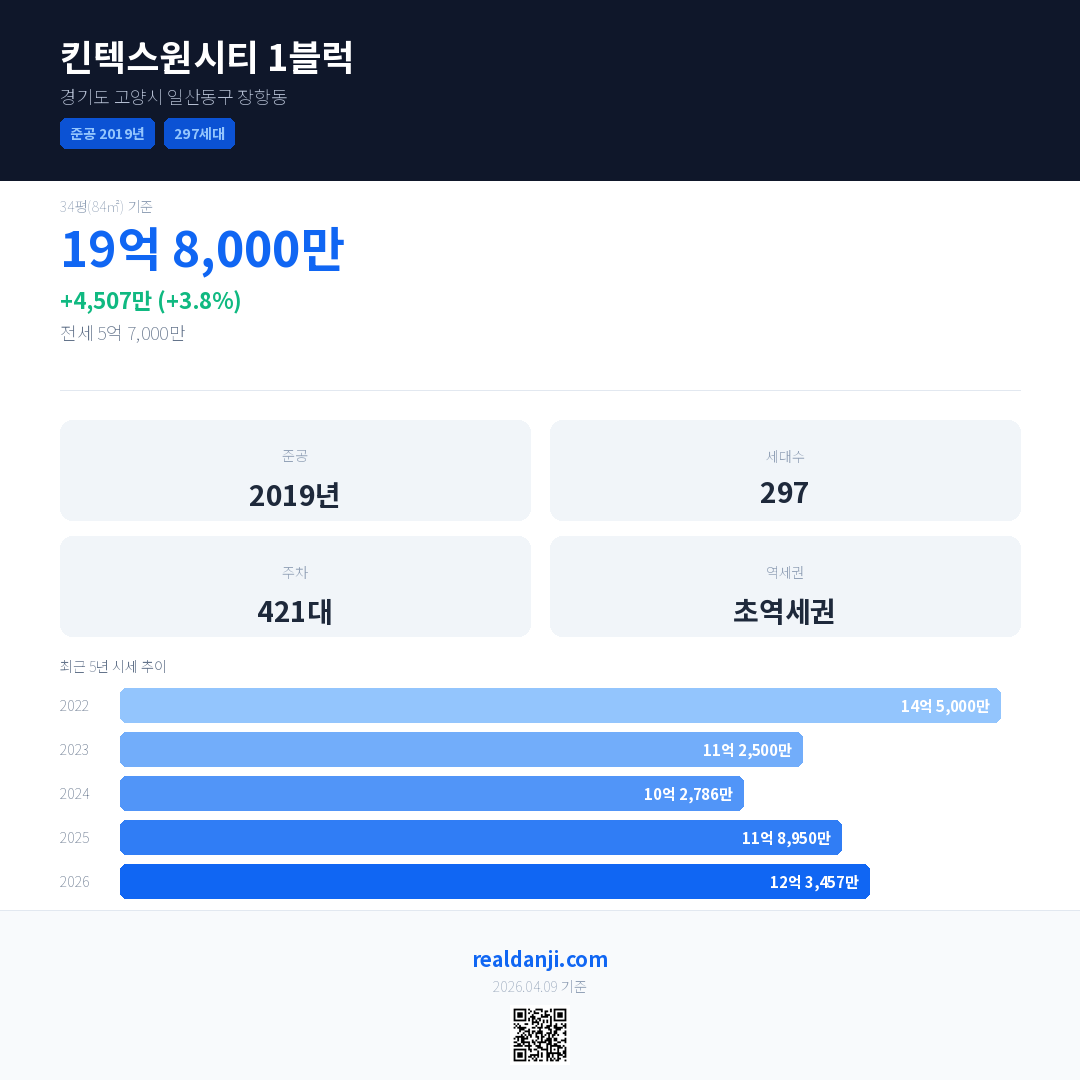 킨텍스원시티 1블럭은(는) 2019년에 준공되었으며, 현재 7년차입니다. 총 297세대 규모입니다.