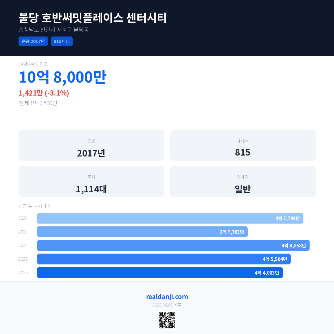 불당 호반써밋플레이스 센터시티 국민평형 기준 2026년 평균 거래가는 4억 4,083만으로, 전년 대비 3.1% 하락 했습니다.