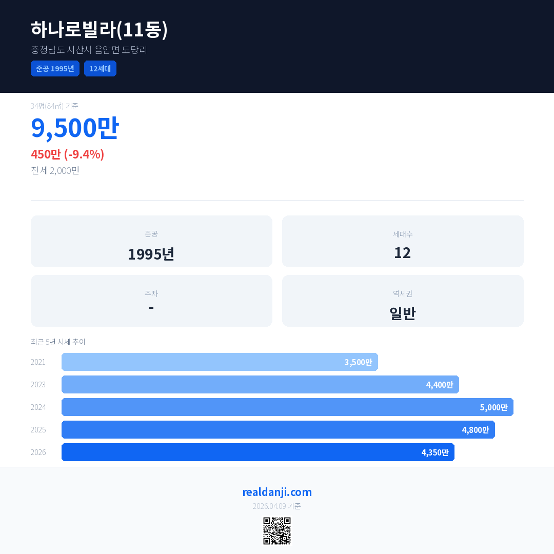 하나로빌라(11동) 최근 거래가는 9,500만입니다. (2026-02)