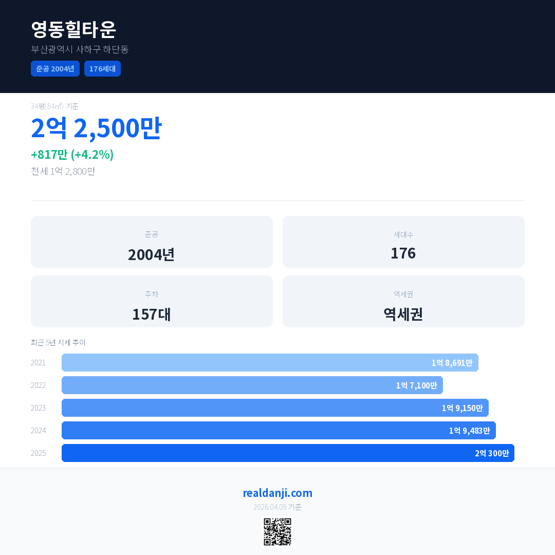 영동힐타운 국민평형 기준 2025년 평균 거래가는 2억 300만으로, 전년 대비 4.2% 상승 했습니다.
