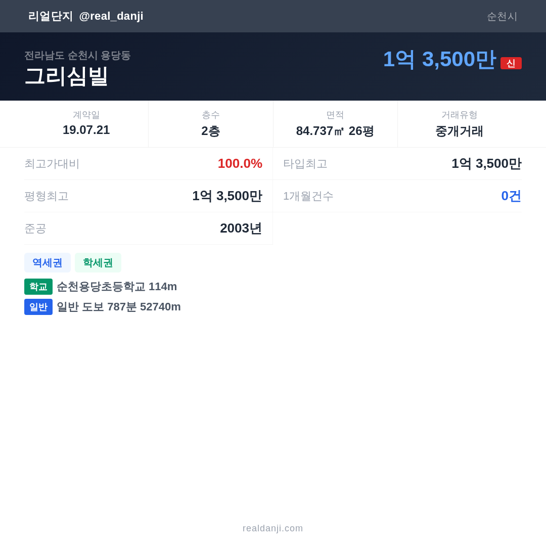 그리심빌 최근 거래가는 1억 3,500만입니다. (2019-07)