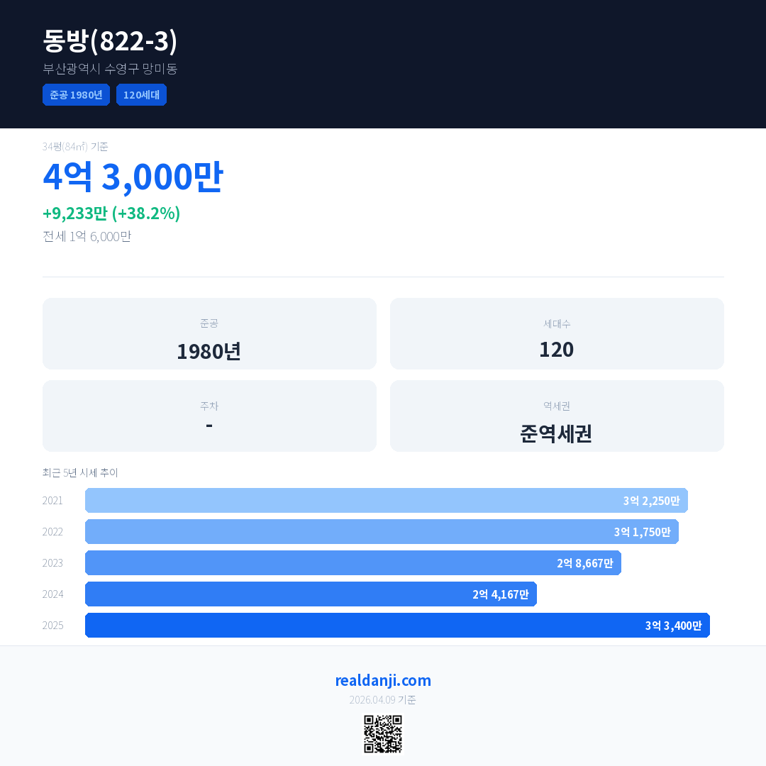 동방(822-3) 국민평형 기준 2025년 평균 거래가는 3억 3,400만으로, 전년 대비 38.2% 상승 했습니다.
