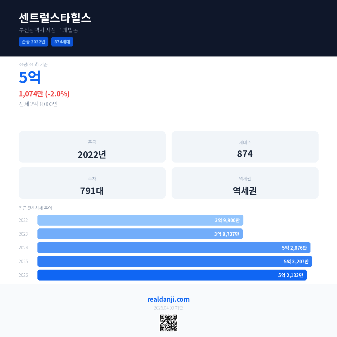 센트럴스타힐스 국민평형 기준 2026년 평균 거래가는 5억 2,133만으로, 전년 대비 2.0% 하락 했습니다.