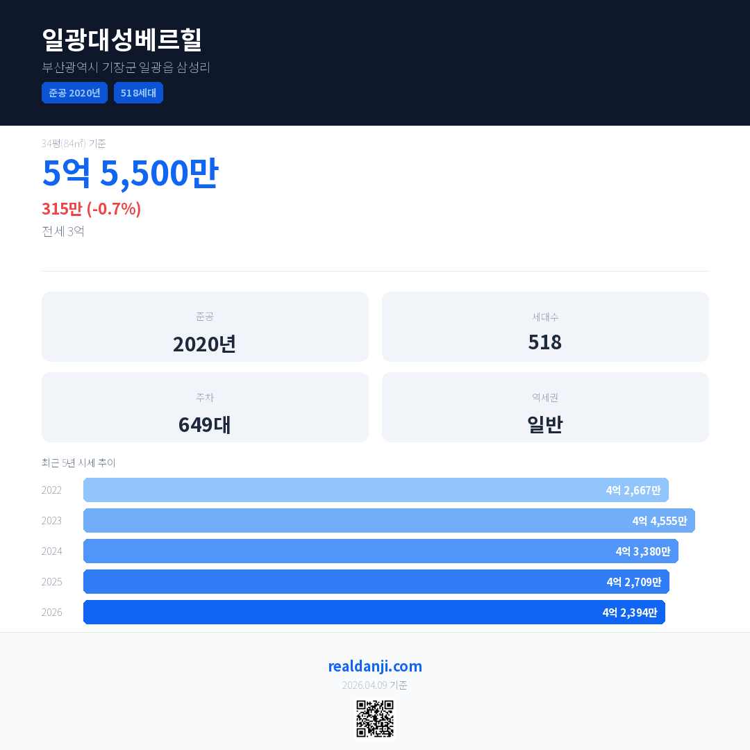 일광대성베르힐 국민평형 기준 2026년 평균 거래가는 4억 2,394만으로, 전년 대비 0.7% 하락 했습니다.
