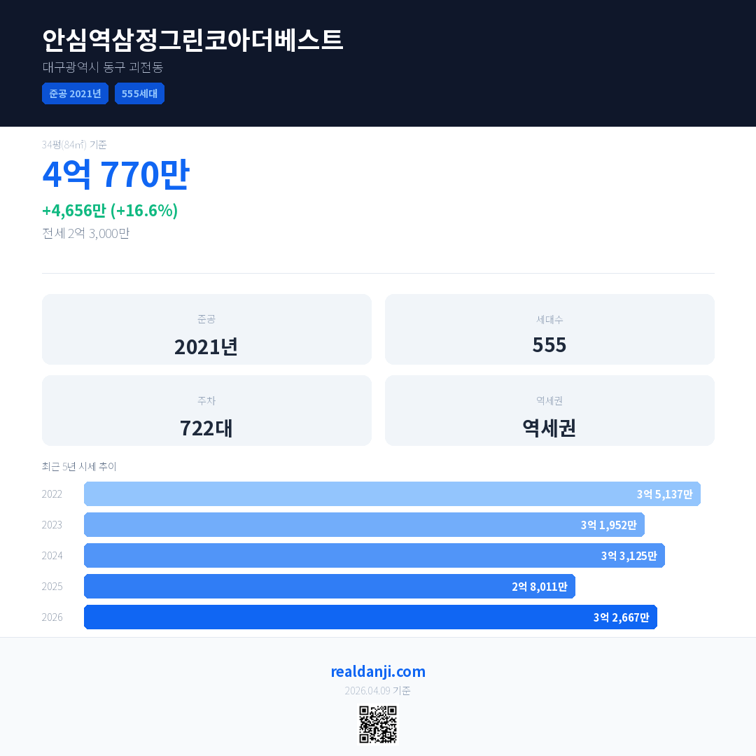 안심역삼정그린코아더베스트은(는) 2021년에 준공되었으며, 현재 5년차입니다. 총 555세대 규모입니다.