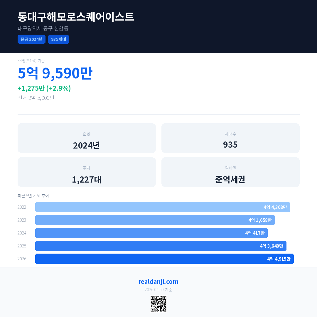 동대구해모로스퀘어이스트 최근 거래가는 5억 9,590만입니다. (2026-03)