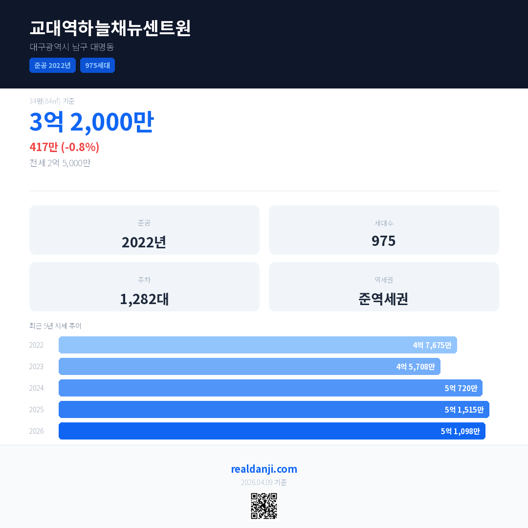 교대역하늘채뉴센트원 국민평형 기준 2026년 평균 거래가는 5억 1,098만으로, 전년 대비 0.8% 하락 했습니다.