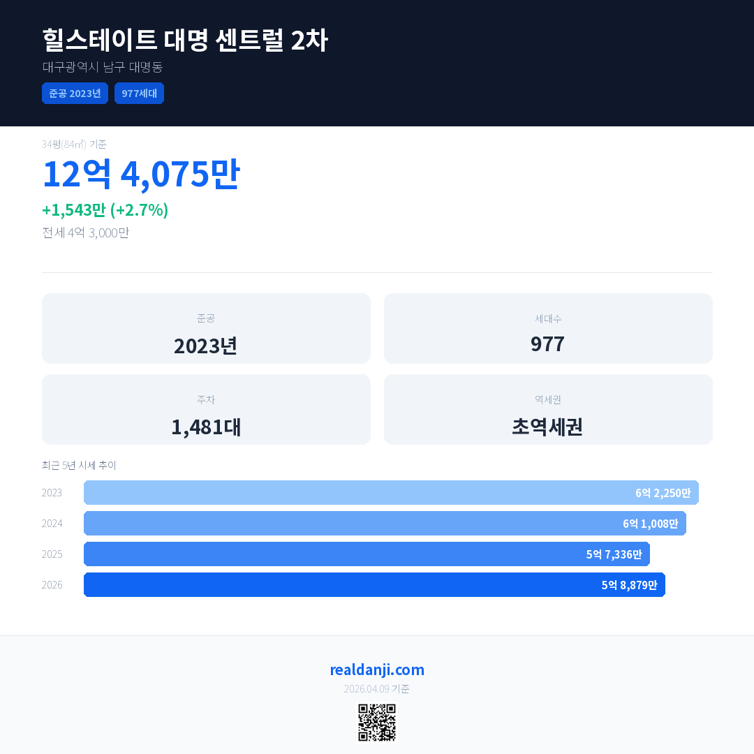 힐스테이트 대명 센트럴 2차 국민평형 기준 2026년 평균 거래가는 5억 8,879만으로, 전년 대비 2.7% 상승 했습니다.