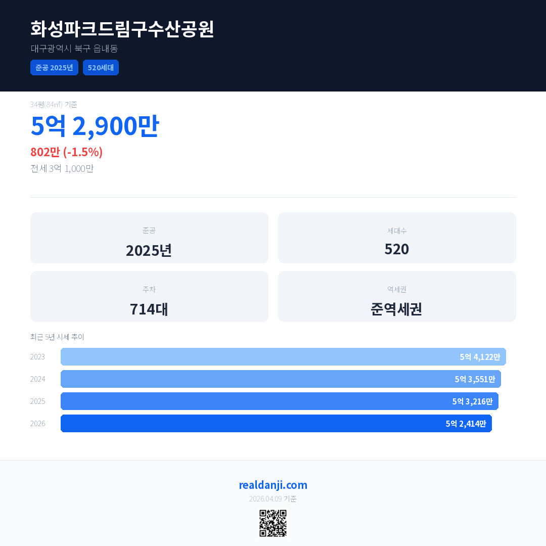 화성파크드림구수산공원 국민평형 기준 2026년 평균 거래가는 5억 2,414만으로, 전년 대비 1.5% 하락 했습니다.