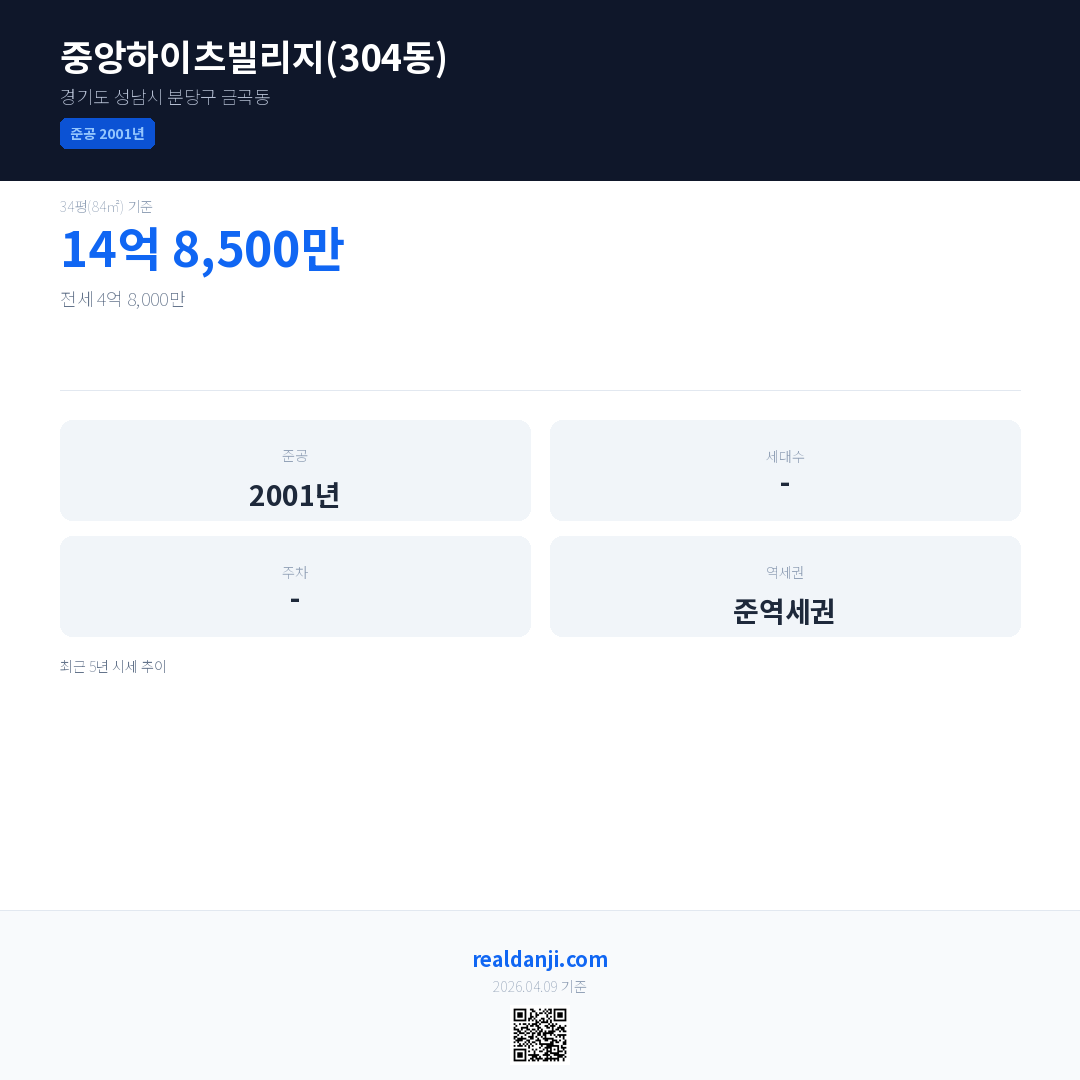 중앙하이츠빌리지(304동)은(는) 2001년에 준공되었으며, 현재 25년차입니다.