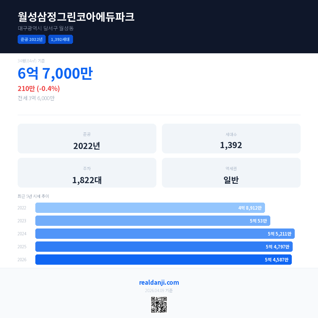월성삼정그린코아에듀파크 최근 거래가는 5억 5,300만입니다. (2026-04)