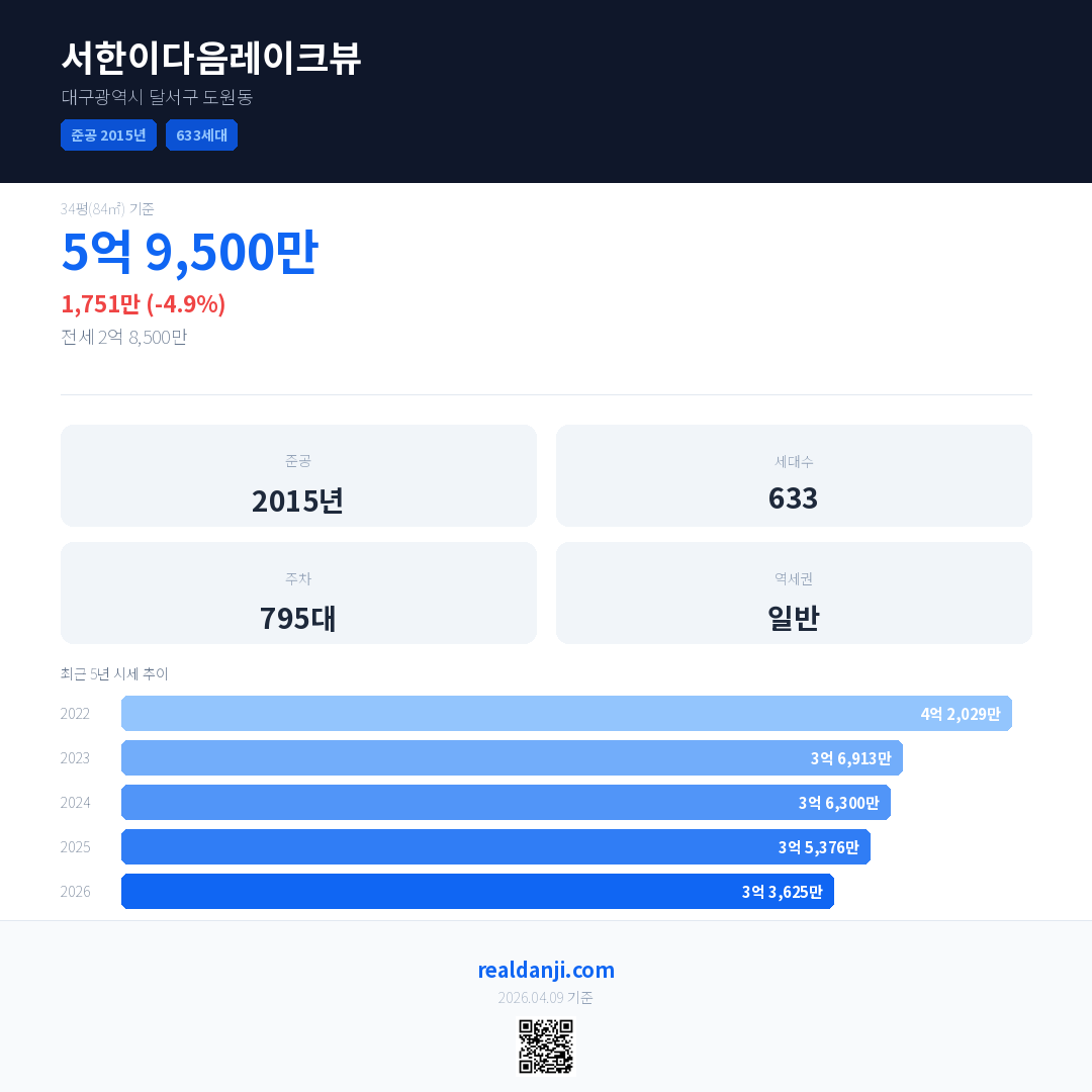서한이다음레이크뷰 국민평형 기준 2026년 평균 거래가는 3억 3,625만으로, 전년 대비 4.9% 하락 했습니다.