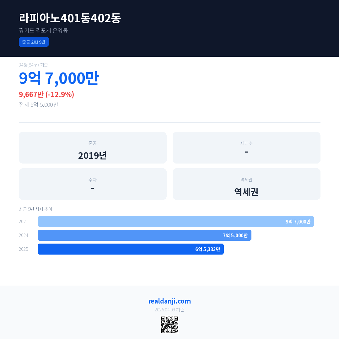 라피아노401동402동 국민평형 기준 2025년 평균 거래가는 6억 5,333만으로, 전년 대비 12.9% 하락 했습니다.
