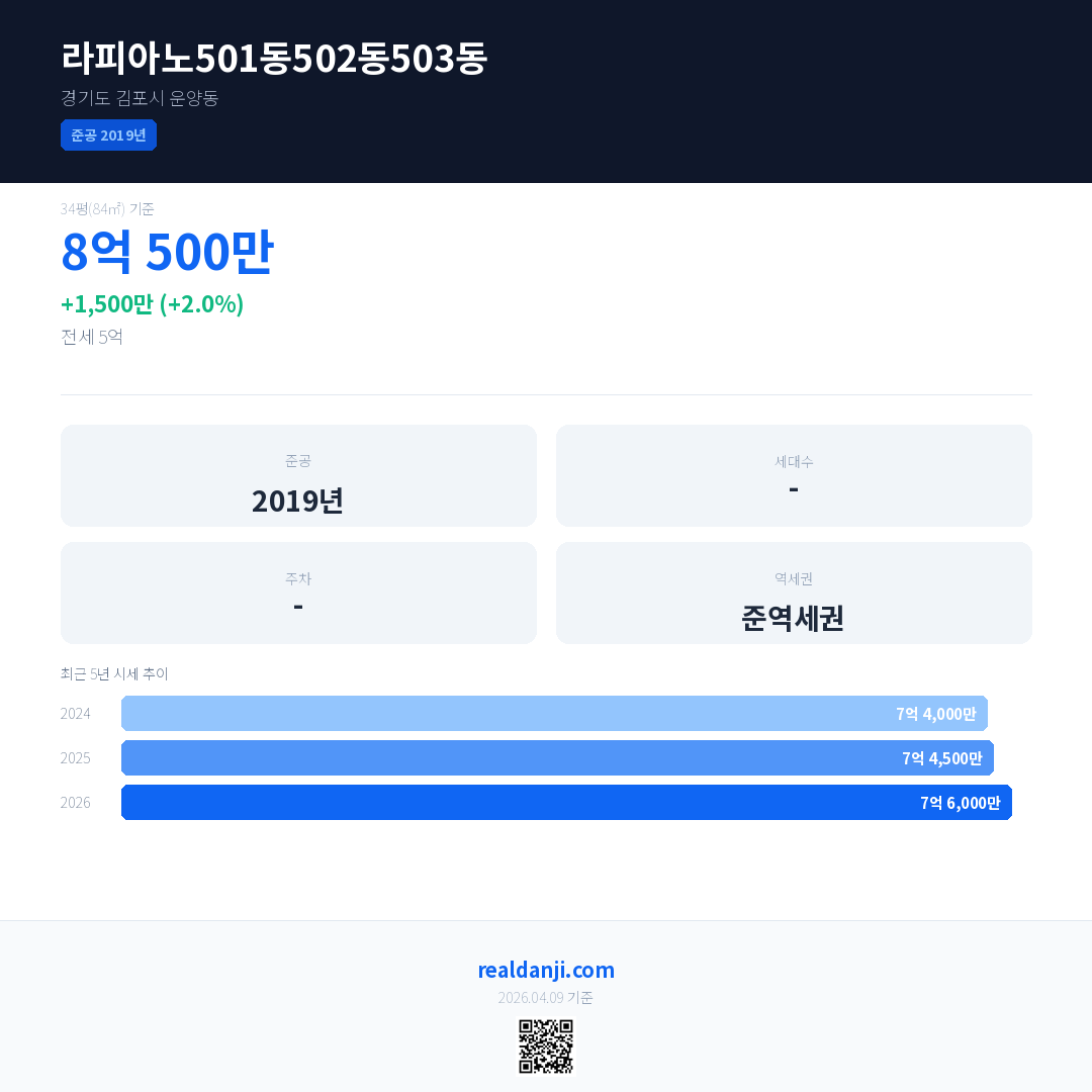 라피아노501동502동503동 국민평형 기준 2026년 평균 거래가는 7억 6,000만으로, 전년 대비 2.0% 상승 했습니다.
