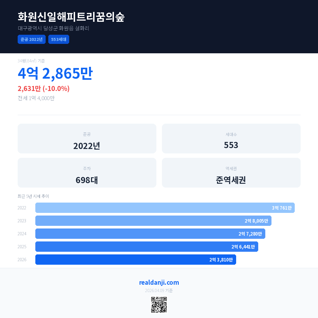 화원신일해피트리꿈의숲 국민평형 기준 2026년 평균 거래가는 2억 3,810만으로, 전년 대비 10.0% 하락 했습니다.
