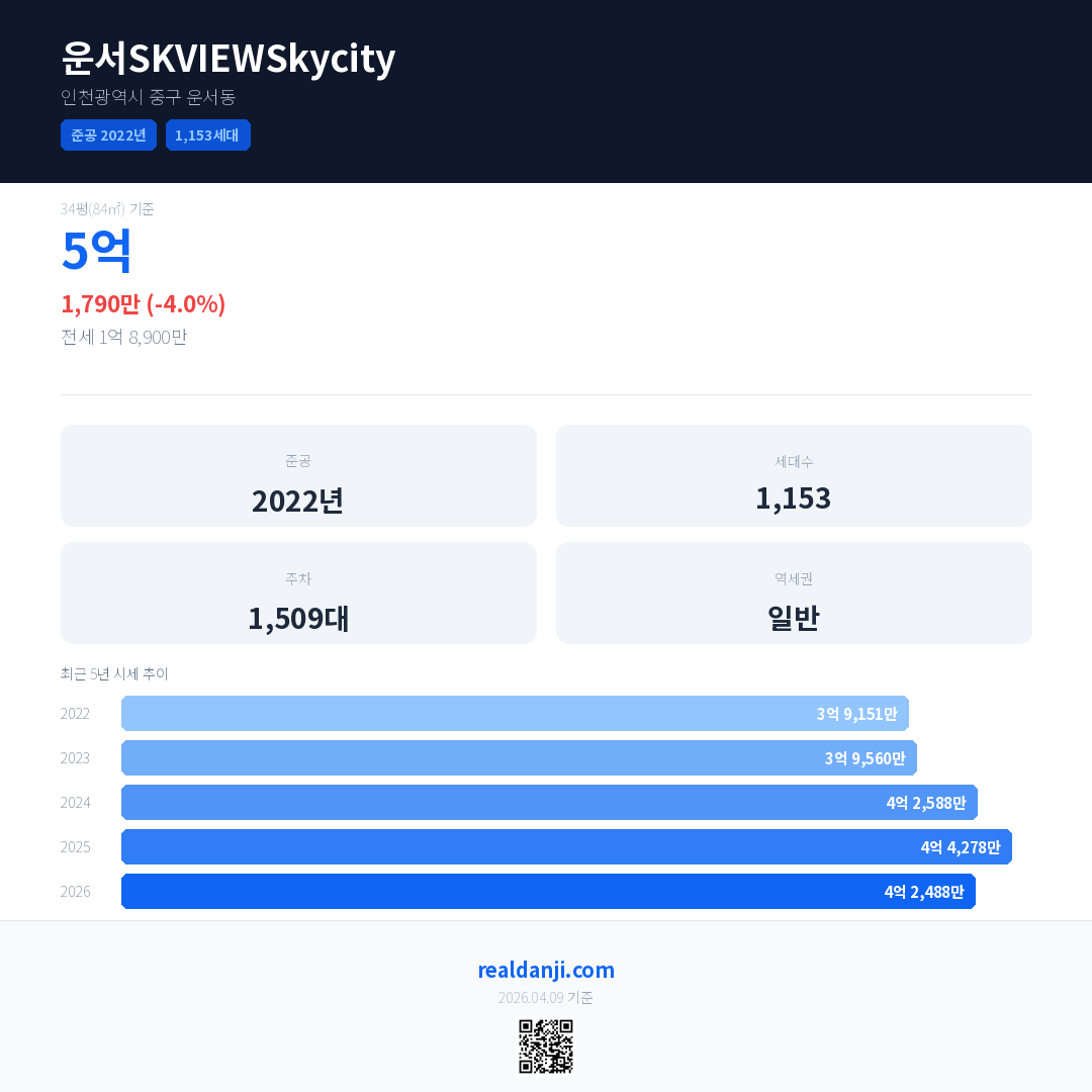 운서SKVIEWSkycity 국민평형 기준 2026년 평균 거래가는 4억 2,488만으로, 전년 대비 4.0% 하락 했습니다.