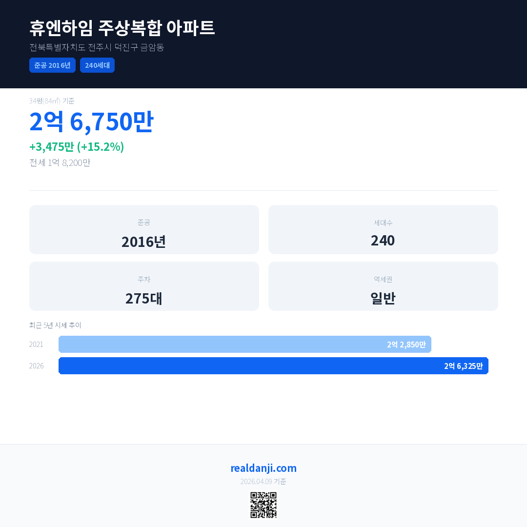 휴엔하임 주상복합 아파트 국민평형 기준 2026년 평균 거래가는 2억 6,325만으로, 전년 대비 15.2% 상승 했습니다.