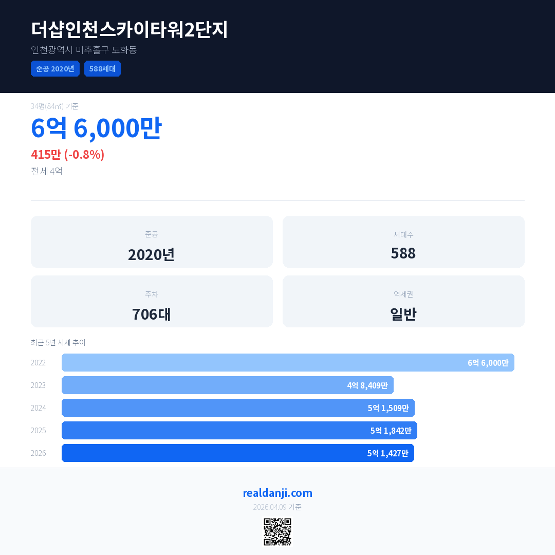 더샵인천스카이타워2단지 최근 거래가는 6억 6,000만입니다. (2026-03)