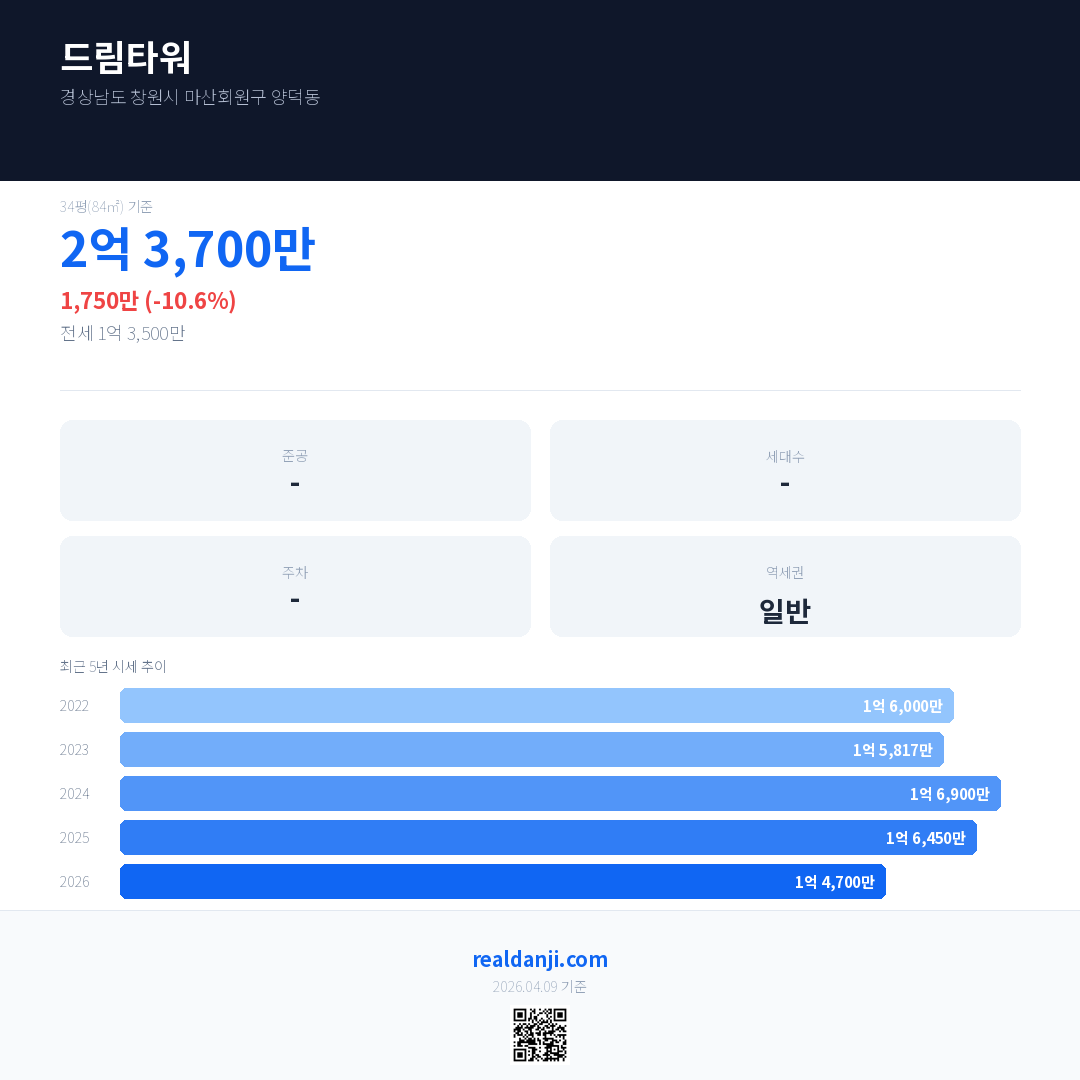 드림타워 국민평형 기준 2026년 평균 거래가는 1억 4,700만으로, 전년 대비 10.6% 하락 했습니다.