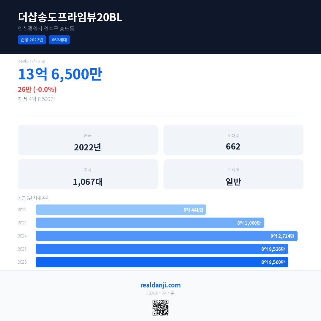 더샵송도프라임뷰20BL 국민평형 기준 2026년 평균 거래가는 8억 9,500만으로, 전년 대비 0.0% 하락 했습니다.