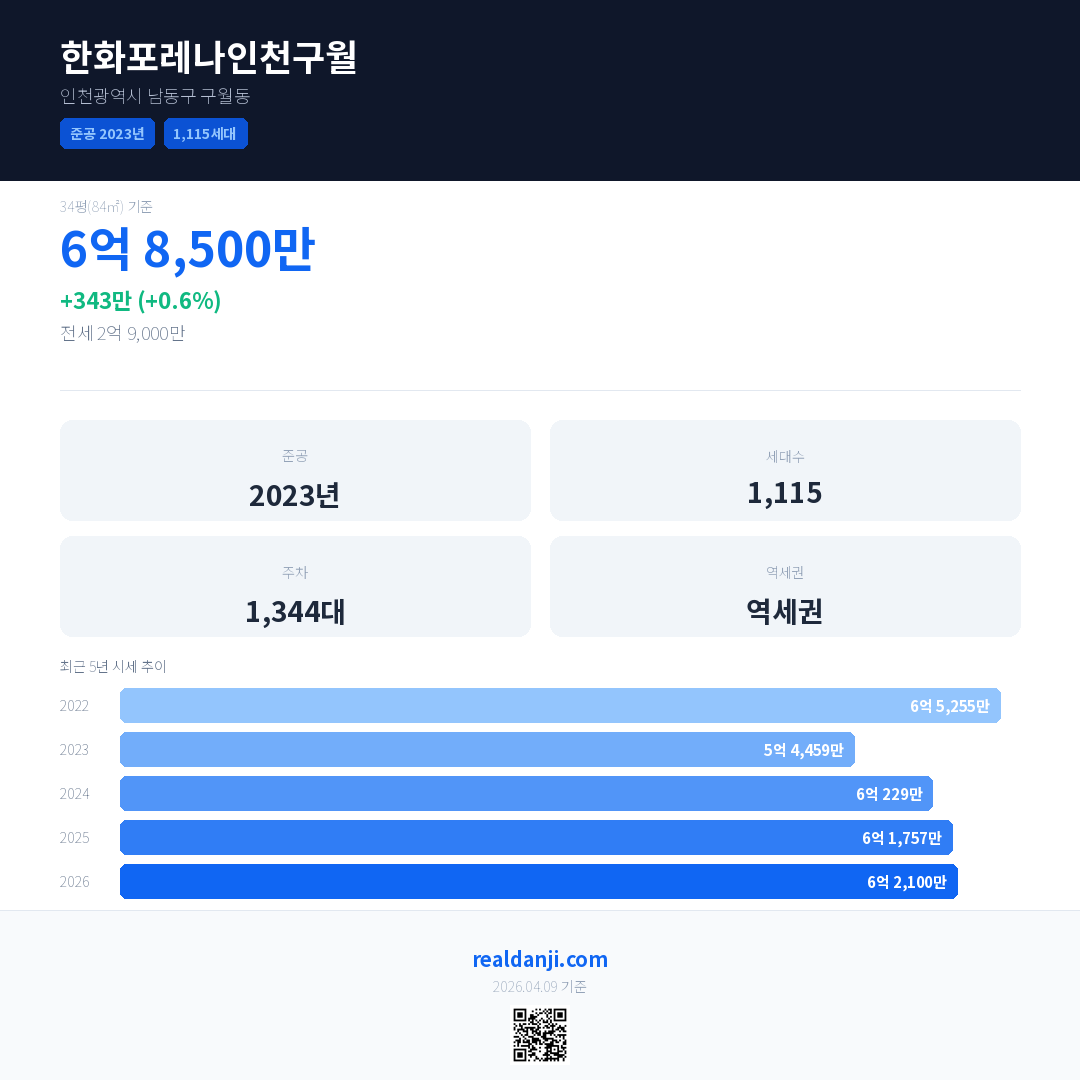 한화포레나인천구월 국민평형 기준 2026년 평균 거래가는 6억 2,100만으로, 전년 대비 0.6% 상승 했습니다.