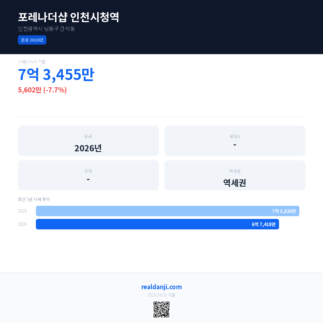 포레나더샵 인천시청역 국민평형 기준 2026년 평균 거래가는 6억 7,418만으로, 전년 대비 7.7% 하락 했습니다.
