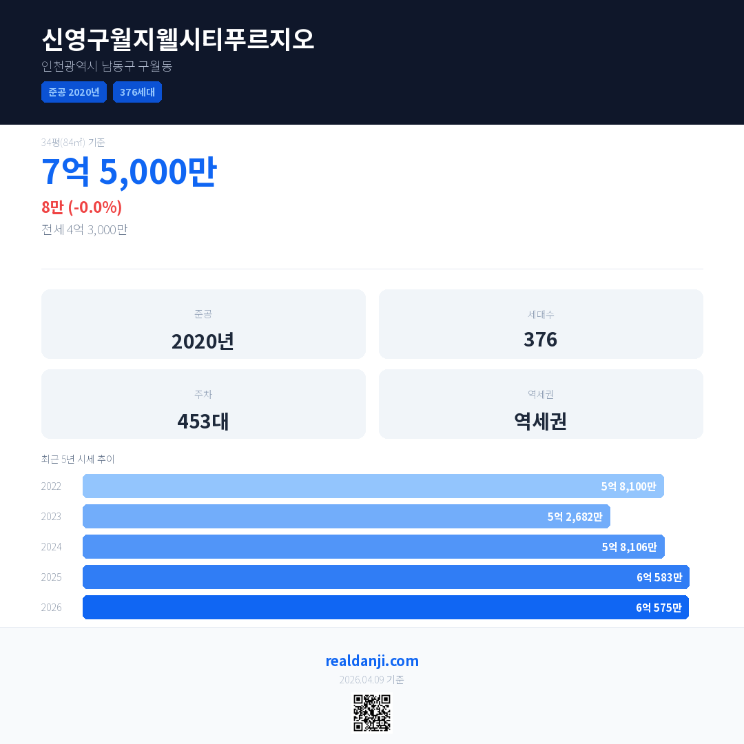 신영구월지웰시티푸르지오은(는) 2020년에 준공되었으며, 현재 6년차입니다. 총 376세대 규모입니다.