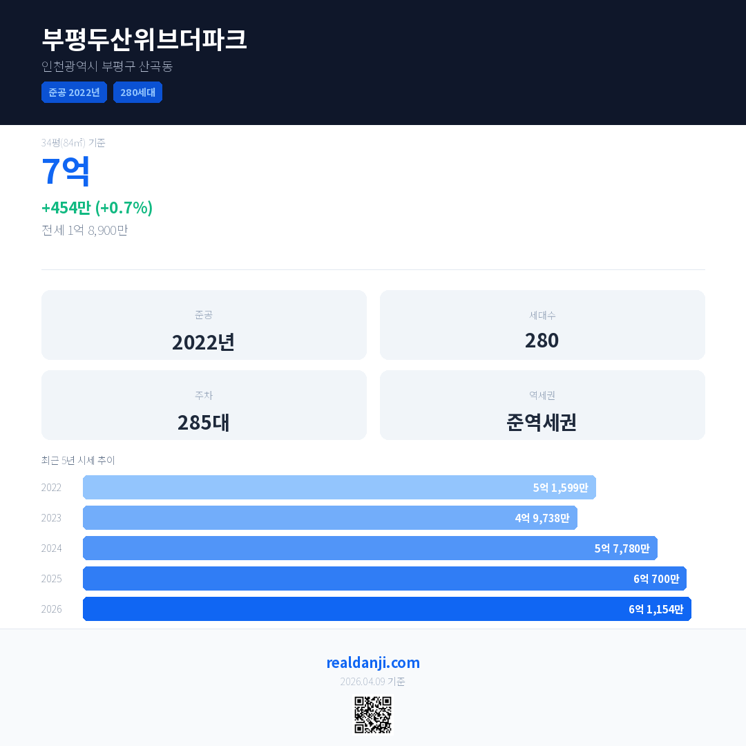 부평두산위브더파크 국민평형 기준 2026년 평균 거래가는 6억 1,154만으로, 전년 대비 0.7% 상승 했습니다.