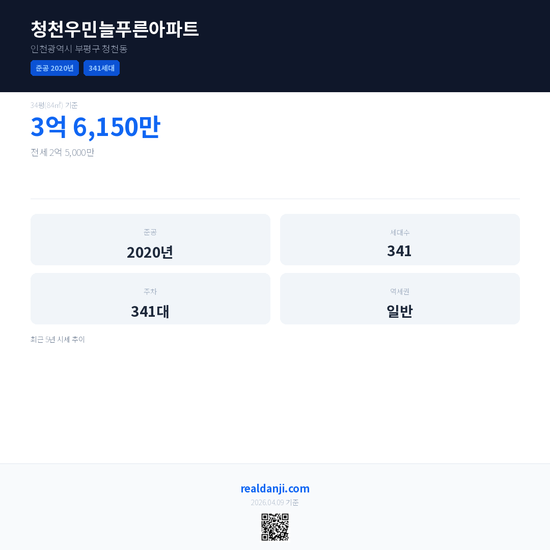 청천우민늘푸른아파트 최근 거래가는 3억 6,150만입니다. (2026-03)
