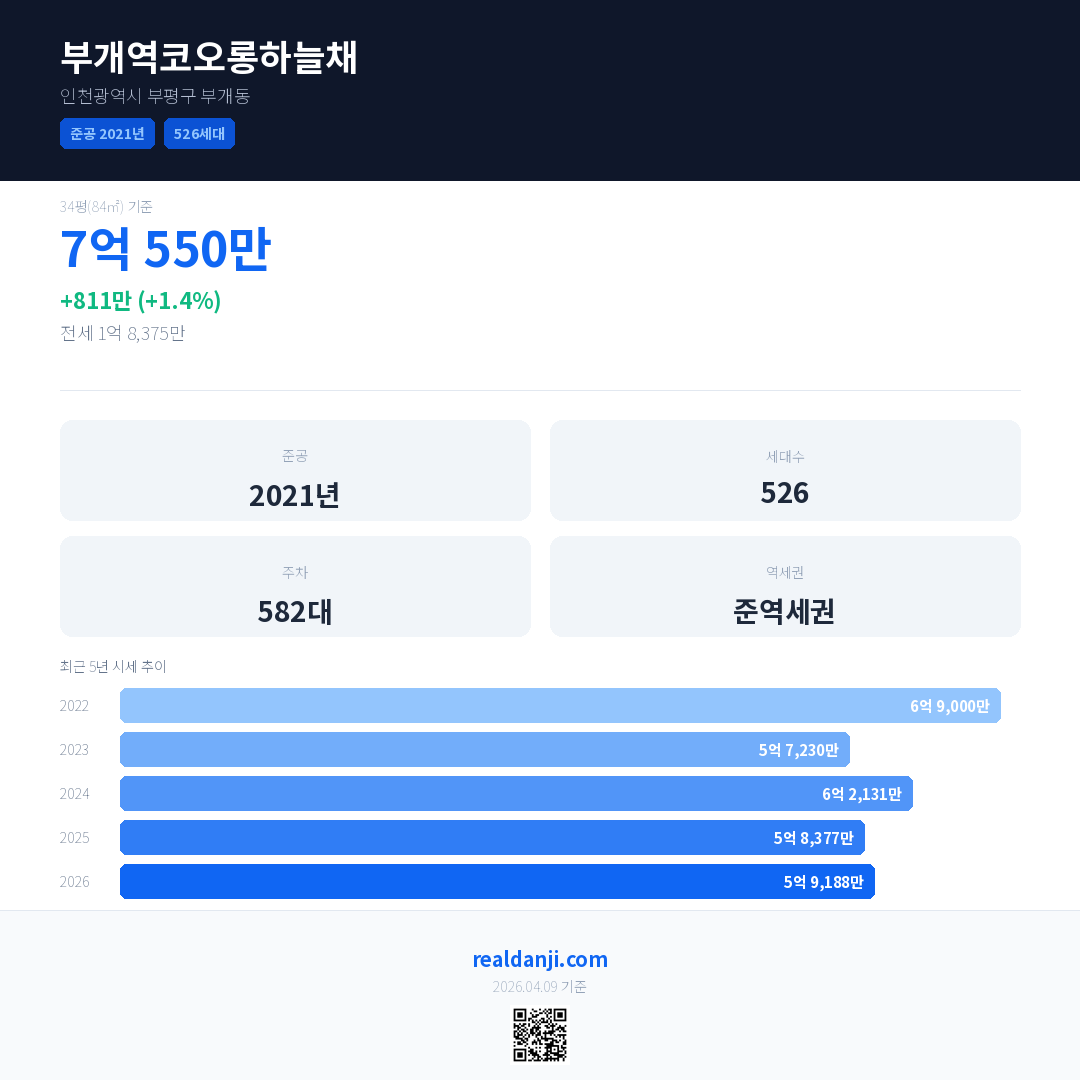 부개역코오롱하늘채 최근 거래가는 7억 550만입니다. (2026-03)