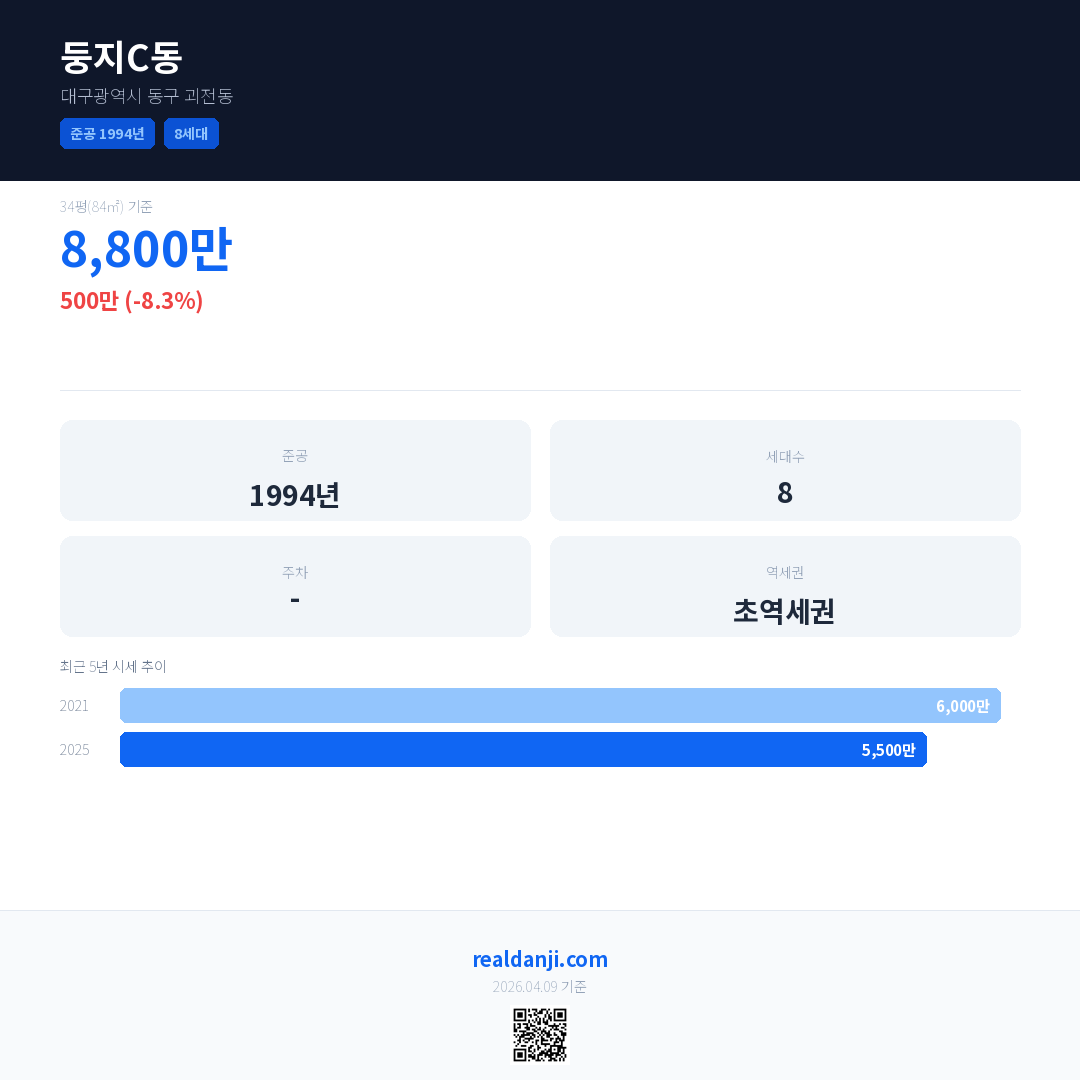 둥지C동 국민평형 기준 2025년 평균 거래가는 5,500만으로, 전년 대비 8.3% 하락 했습니다.