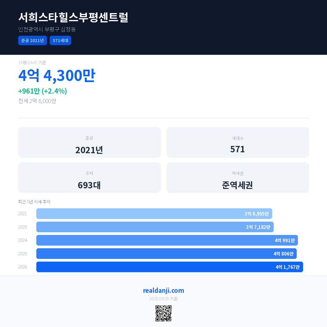 서희스타힐스부평센트럴 최근 거래가는 4억 4,300만입니다. (2026-03)