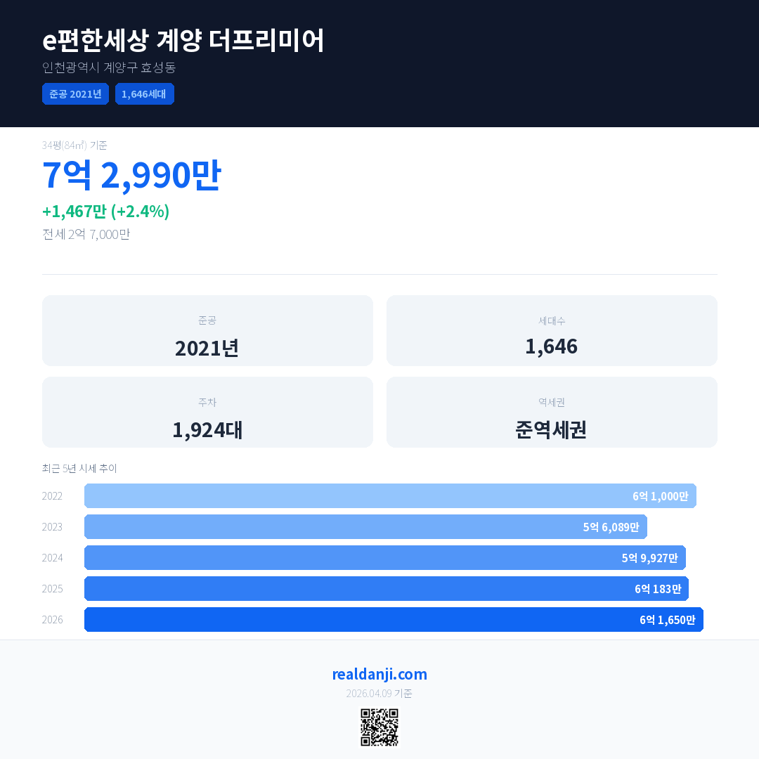 e편한세상 계양 더프리미어 국민평형 기준 2026년 평균 거래가는 6억 1,650만으로, 전년 대비 2.4% 상승 했습니다.