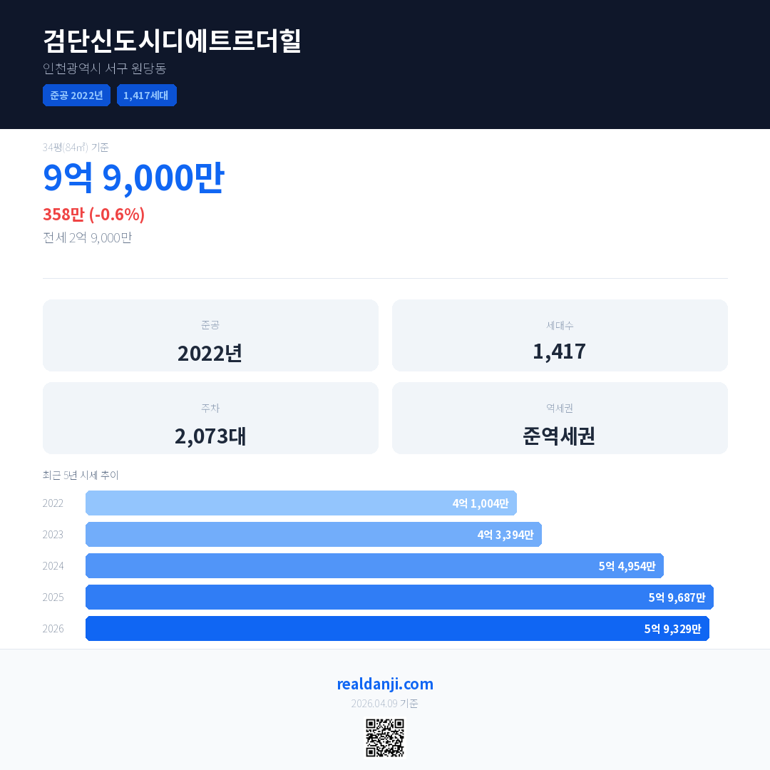 검단신도시디에트르더힐 최근 거래가는 9억 9,000만입니다. (2026-04)