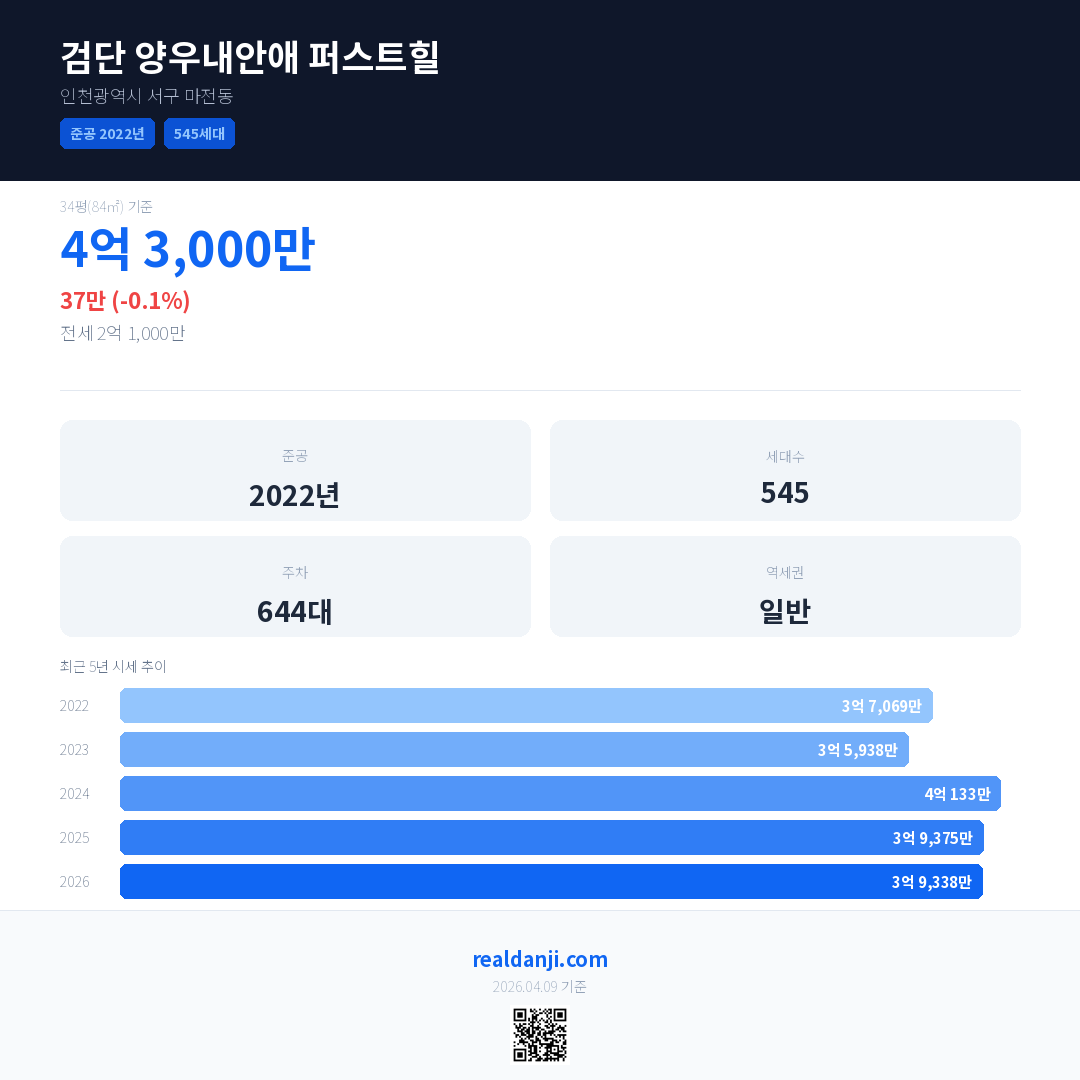 검단 양우내안애 퍼스트힐 최근 거래가는 4억 3,000만입니다. (2026-03)