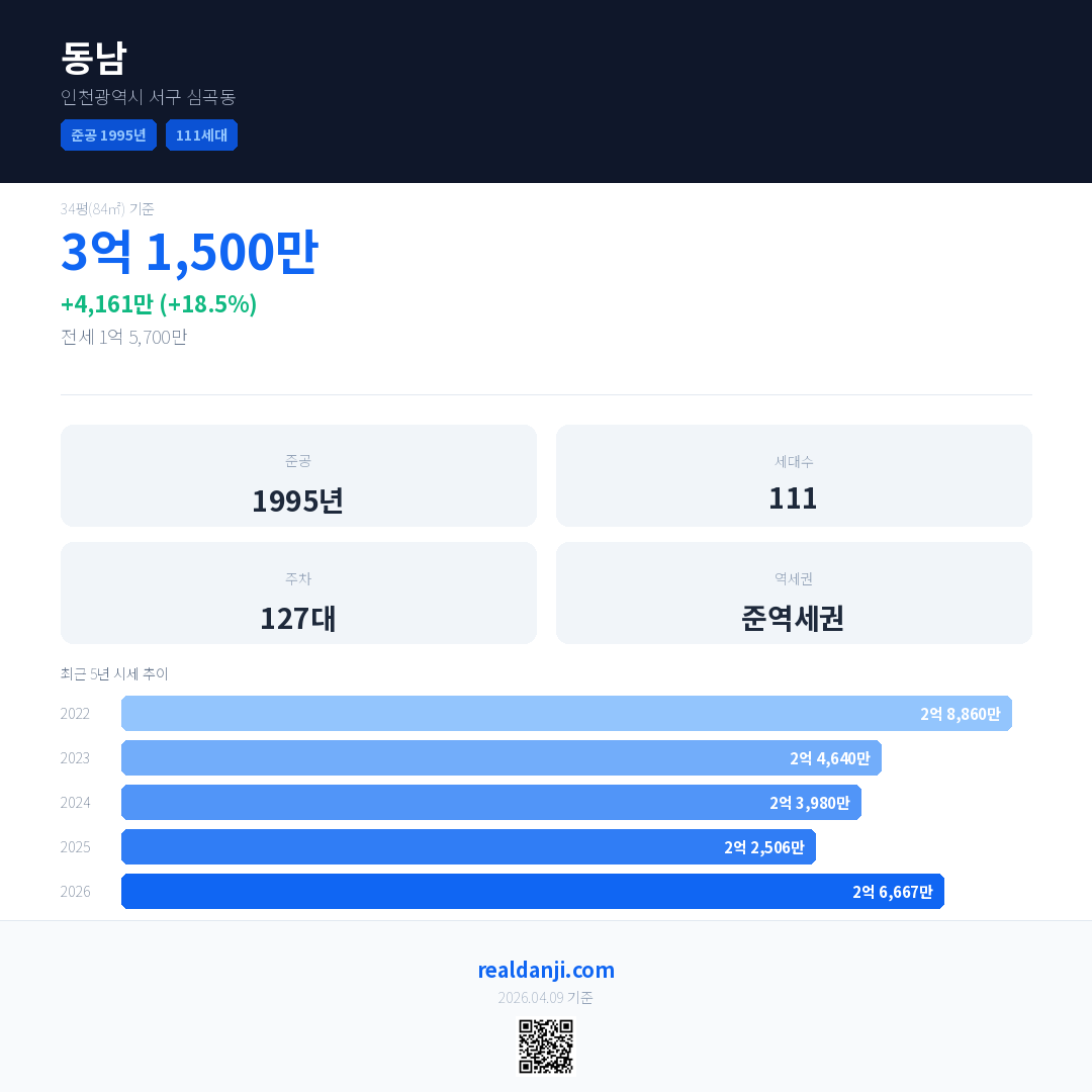 동남 국민평형 기준 2026년 평균 거래가는 2억 6,667만으로, 전년 대비 18.5% 상승 했습니다.
