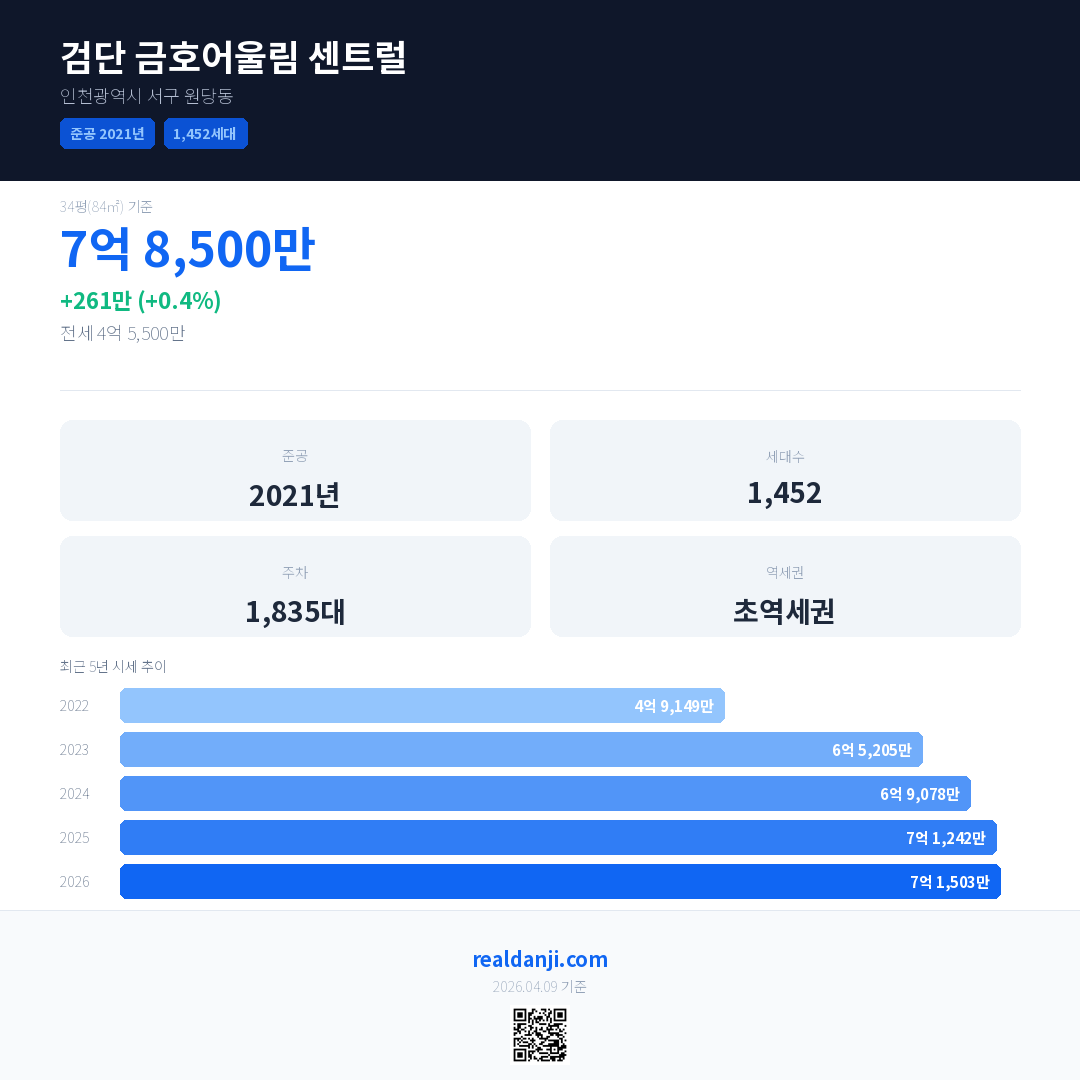 검단 금호어울림 센트럴 국민평형 기준 2026년 평균 거래가는 7억 1,503만으로, 전년 대비 0.4% 상승 했습니다.