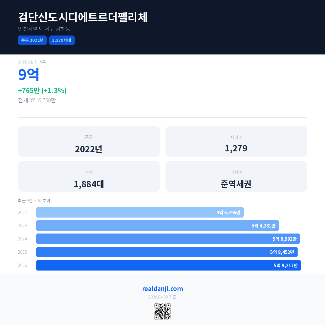 검단신도시디에트르더펠리체 최근 거래가는 9억입니다. (2026-03)