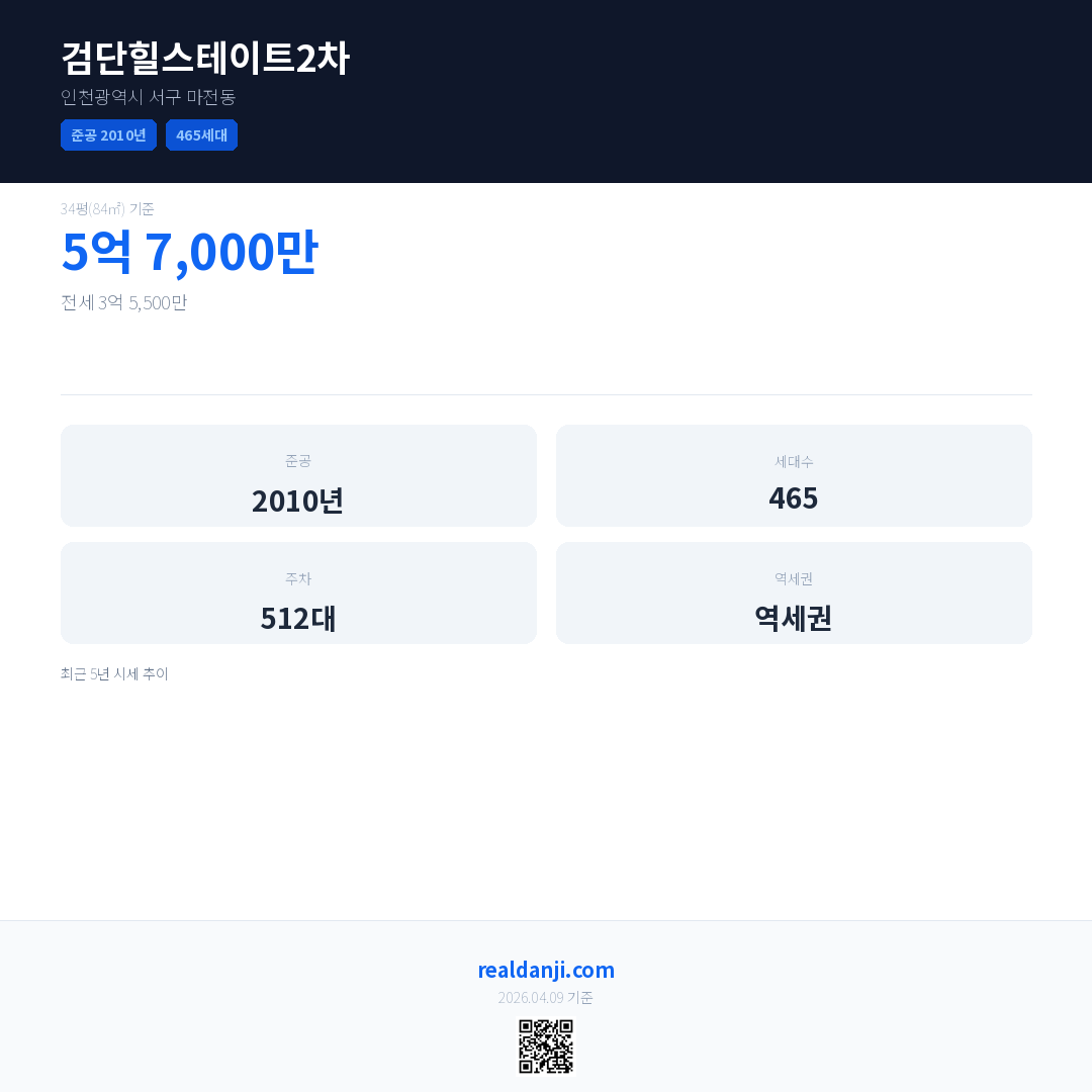 검단힐스테이트2차 최근 거래가는 5억 7,000만입니다. (2026-02)