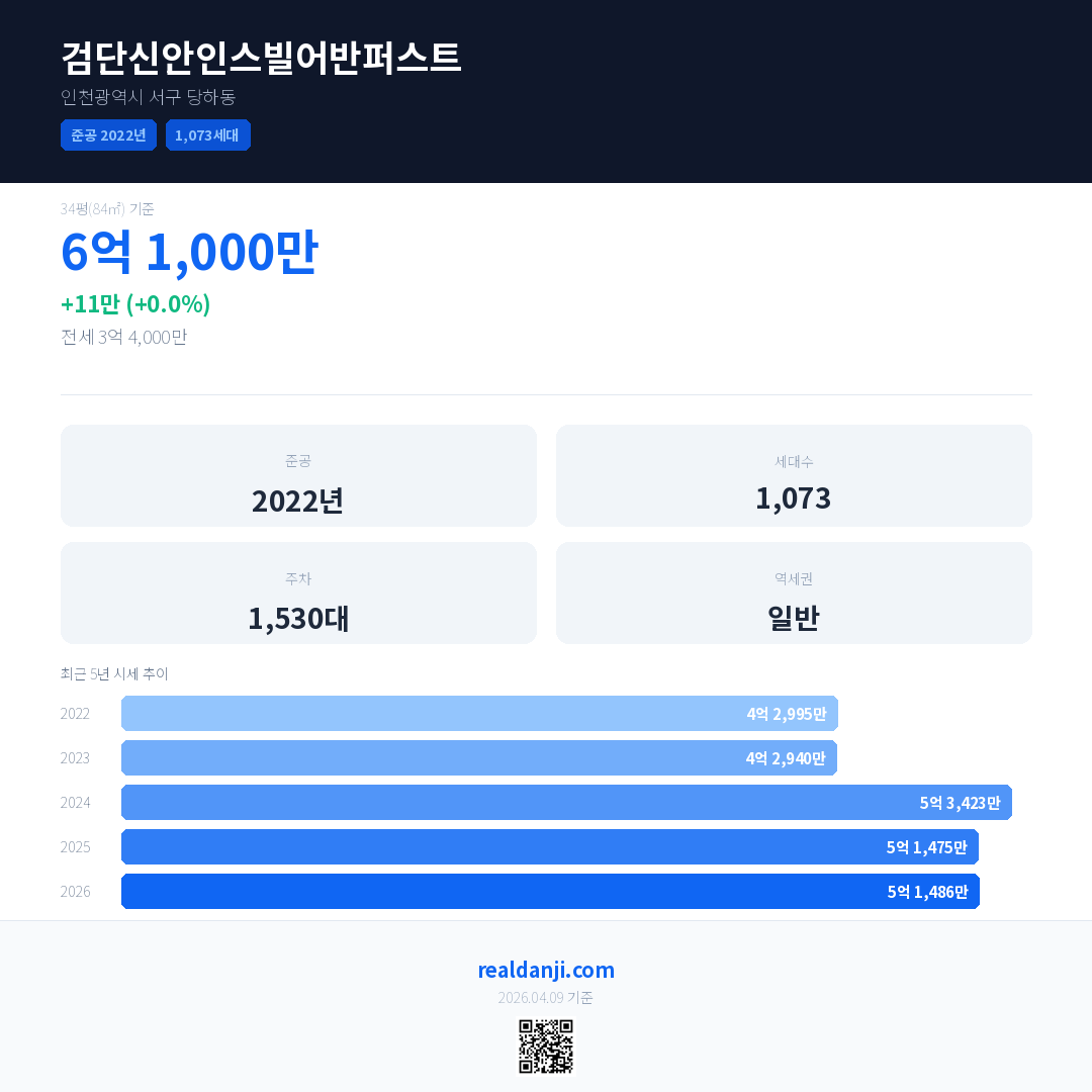 검단신안인스빌어반퍼스트은(는) 2022년에 준공되었으며, 현재 4년차입니다. 총 1,073세대 규모입니다.