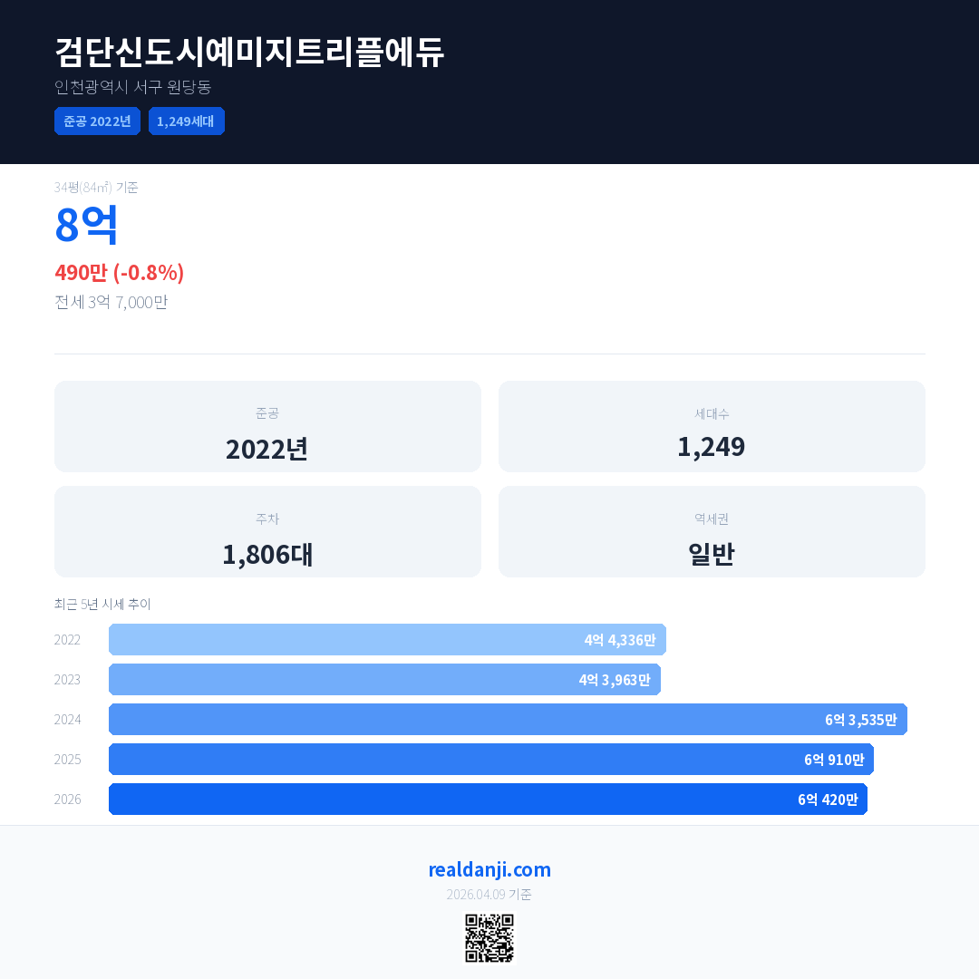 검단신도시예미지트리플에듀 최근 거래가는 8억입니다. (2026-04)