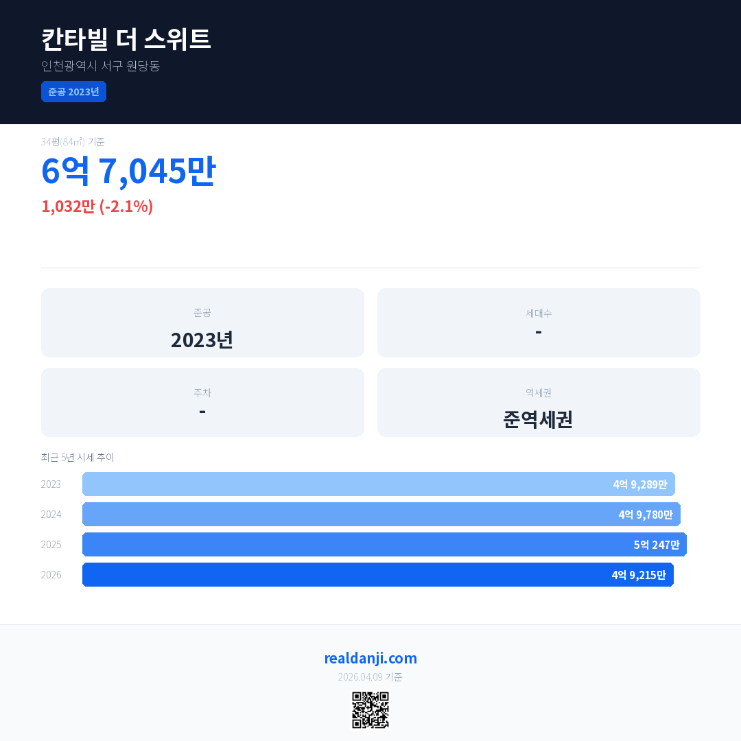 칸타빌 더 스위트 국민평형 기준 2026년 평균 거래가는 4억 9,215만으로, 전년 대비 2.1% 하락 했습니다.