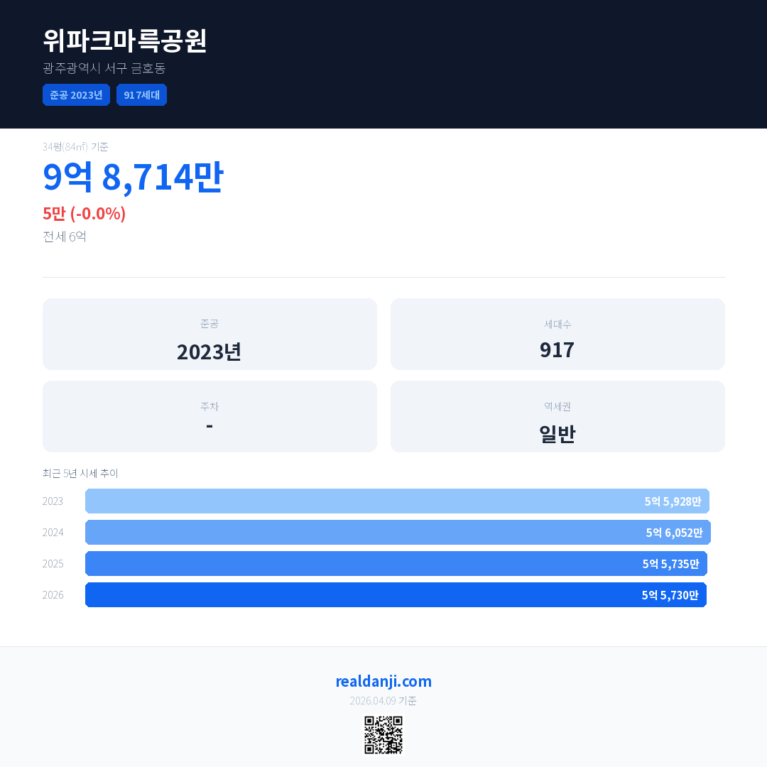 위파크마륵공원 국민평형 기준 2026년 평균 거래가는 5억 5,730만으로, 전년 대비 0.0% 하락 했습니다.