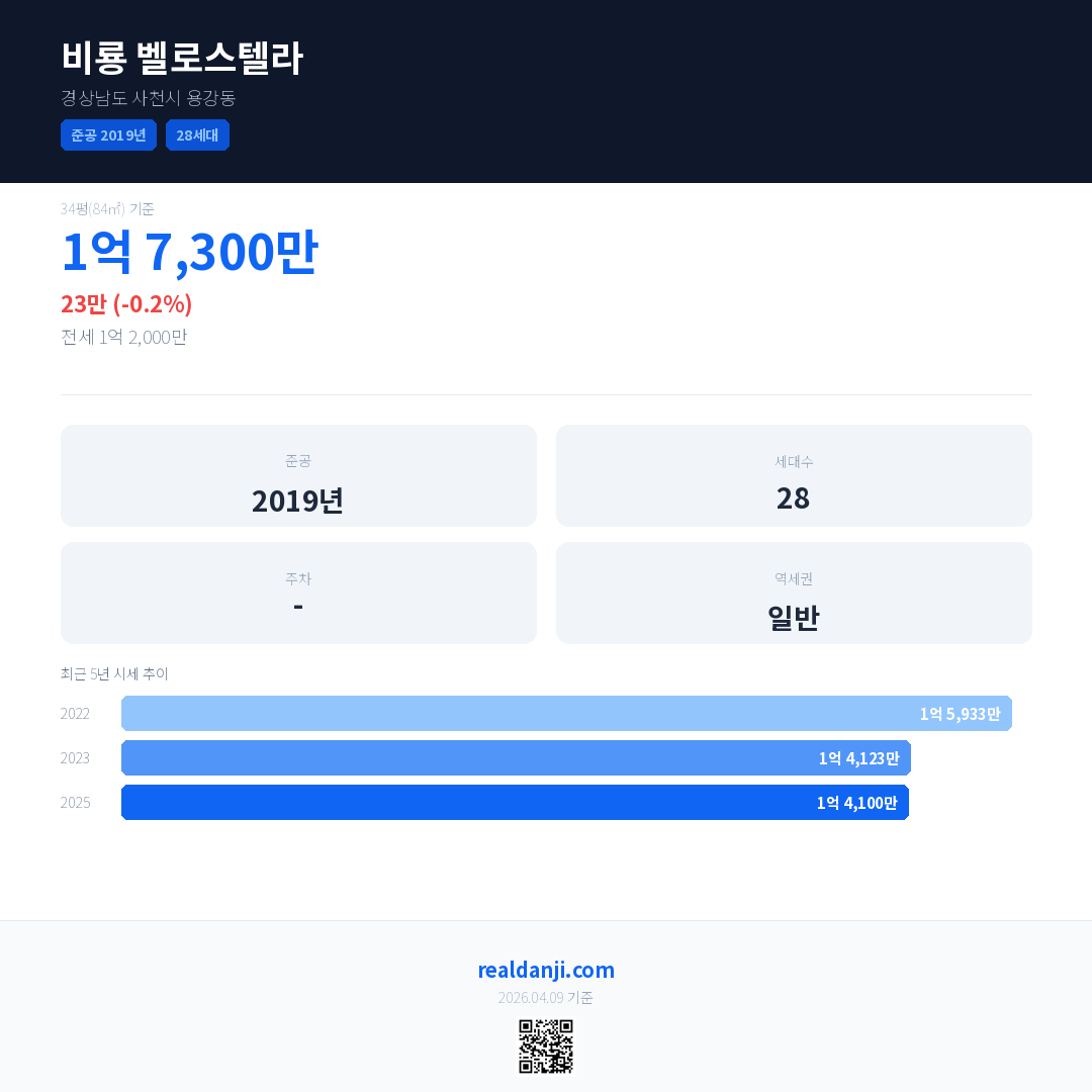 비룡 벨로스텔라 국민평형 기준 2025년 평균 거래가는 1억 4,100만으로, 전년 대비 0.2% 하락 했습니다.