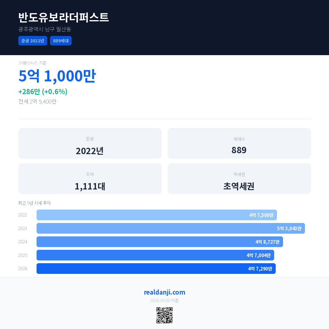 반도유보라더퍼스트은(는) 2022년에 준공되었으며, 현재 4년차입니다. 총 889세대 규모입니다.