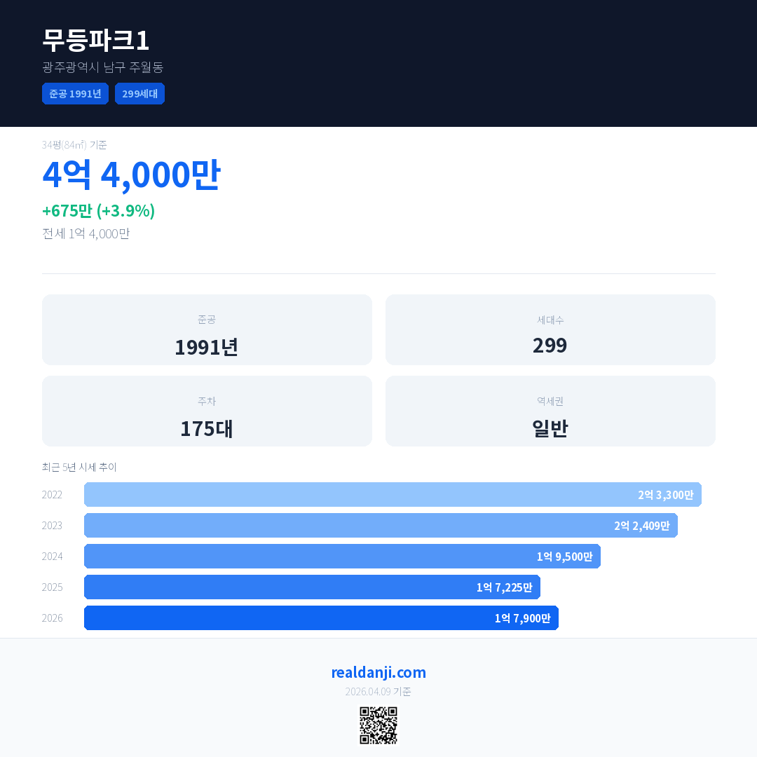 무등파크1 국민평형 기준 2026년 평균 거래가는 1억 7,900만으로, 전년 대비 3.9% 상승 했습니다.